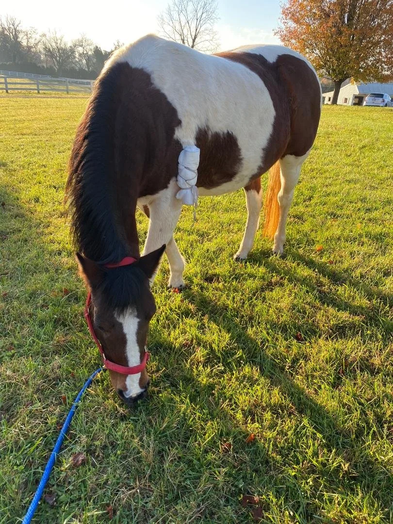 Exercise restriction is important for a wound like this. This horse spent a few weeks hand grazing instead of being turned out.