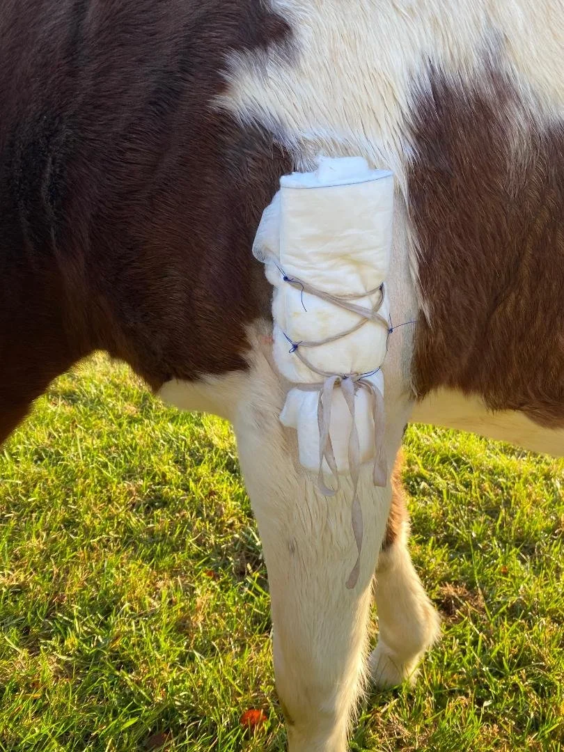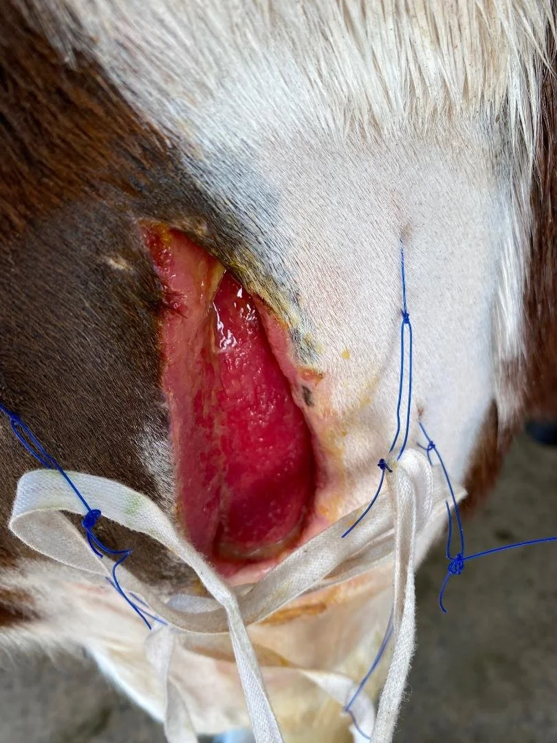 Here is the initial wound. Note the stay sutures placed in the skin. These are used to hold the bandage in place.